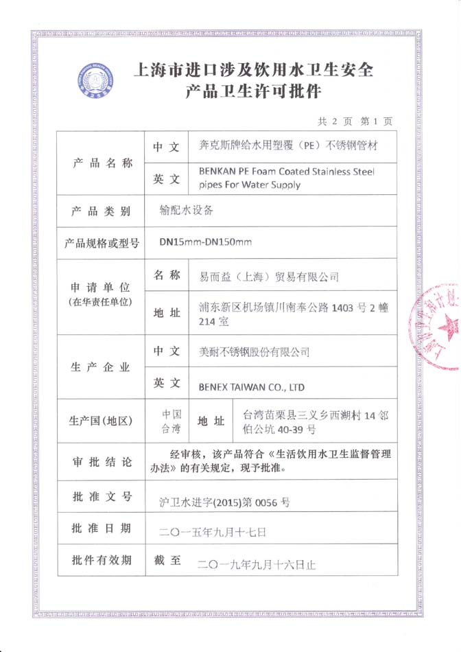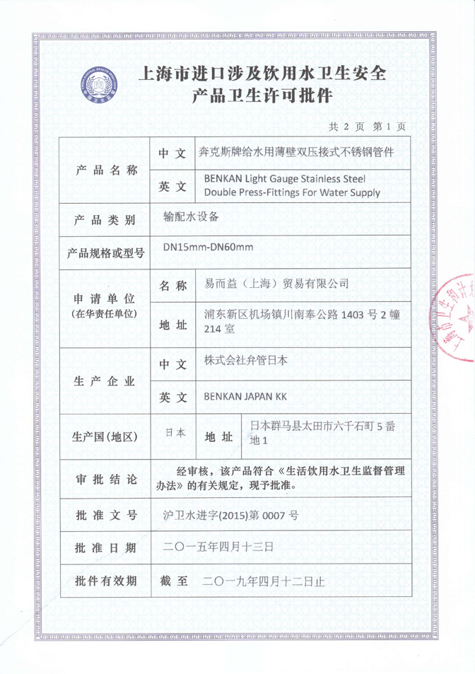 卡压管件卫生许可