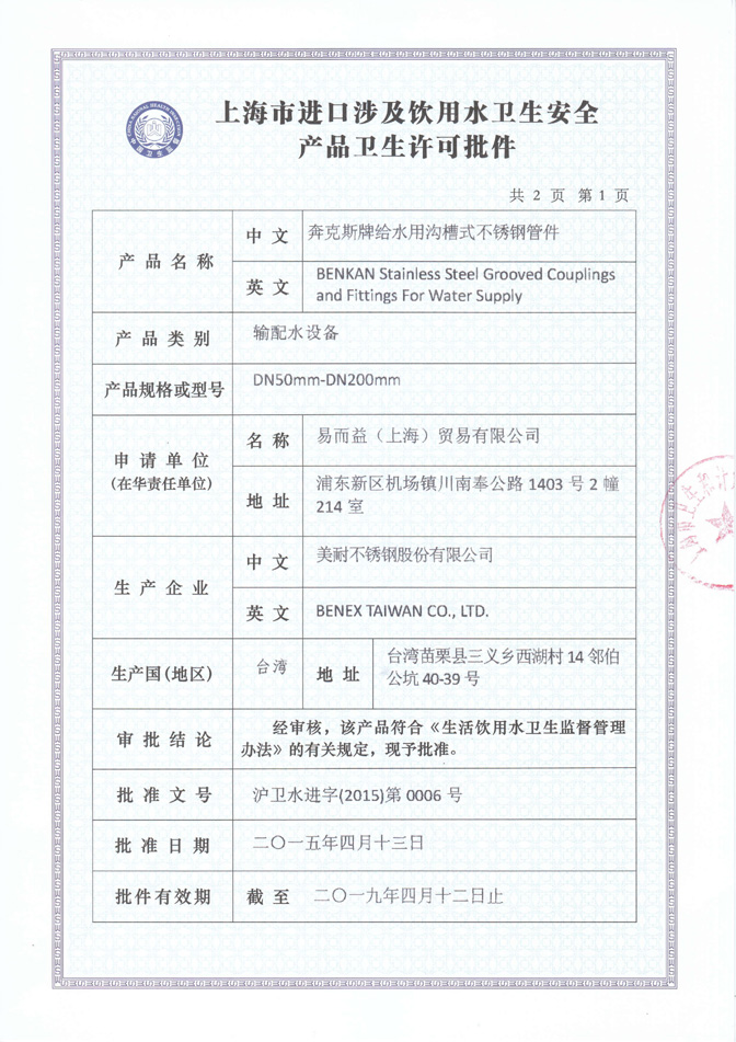 沟槽管件卫生许可